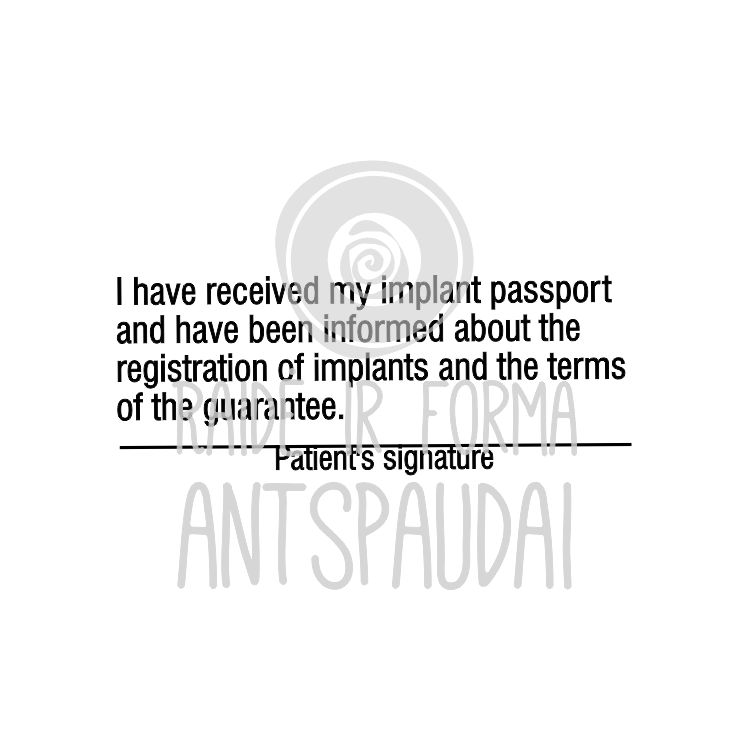 Antspaudas patogus naudoti su reikiama informacija. Gydymo įstaigos turi įvairių reikalavimų, galim pagaminti ir kitokiu tekstu. Antspaudai sveikatos specialistams palengvina darbą. Antspaudų gamyba suderinus maketą užtrunka 1-2 d.d. Pavyzdyje antspaudas Colop Printer 30 (18 x 47 mm) Tekstą galime pakoreguoti.